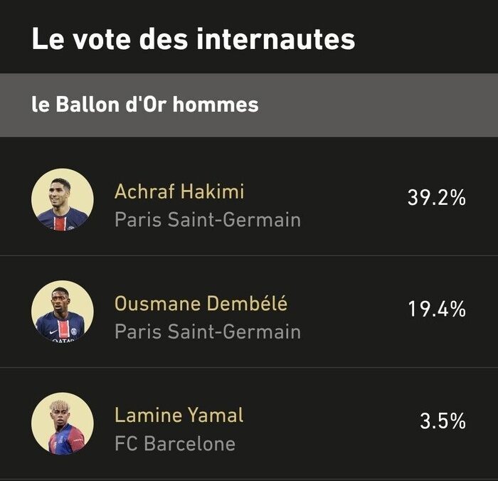 ويتربع الدولي المغربي أشرف حكيمي حالياً على صدارة الترتيب المؤقت، متقدماً على الفرنسي عثمان ديمبيلي والإسباني لامين يامال، فيما يظل التصويت مفتوحاً أمام الجماهير.