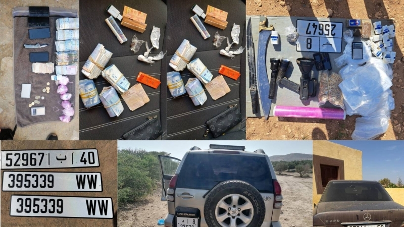 كما تم ضبط تجهيزات لوجيستيكية متطورة، من بينها ست سيارات مستعملة في عمليات النقل والتوزيع، موازين إلكترونية دقيقة، بندقية صيد، أسلحة بيضاء متنوعة (سيوف وسواطير)، بالإضافة إلى ثماني لوحات ترقيم مزورة تستعمل للتمويه أثناء التنقلات.