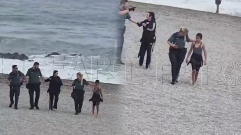 وفي التفاصيل نتابع السيدة السباحة مع ابنها، الذي يرتدي حزام نجاة من اجل المساعدة. محاولان تجنب الغرق، فيما يقوم عناصر الحرس المدني الإسباني بتوجيههما للرمال. لتصلا اليابسة وسط بحر هائج بصعوبة كبيرة.